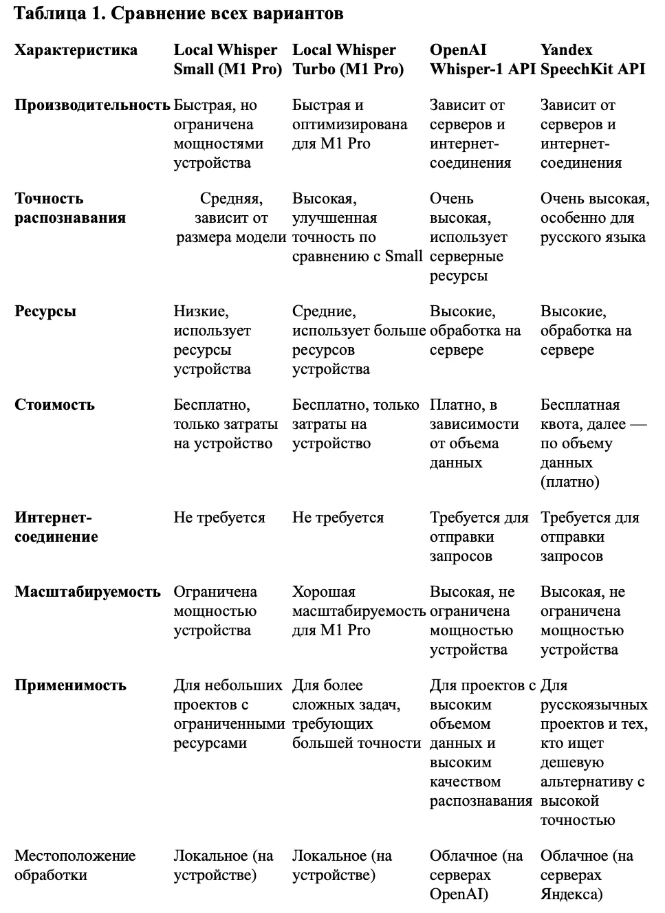 В данном разделе мы более подробно рассмотрим различия между различными вариантами модели Whisper (Local Whisper Small, Whisper Turbo и OpenAI Whisper-1 API) и Yandex SpeechKit с точки зрения ключевых факторов: производительности, точности, ресурсов, стоимости, масштабируемости и необходимости подключения к интернету. Все данные можете рассмотреть по рисунку в