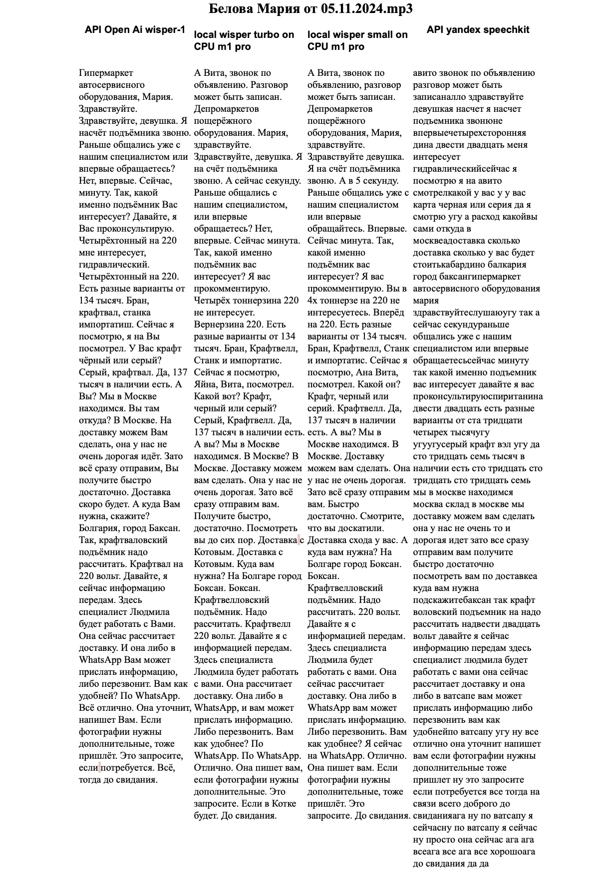 Таблице 2. Результат транскрбирования аудио файлов.